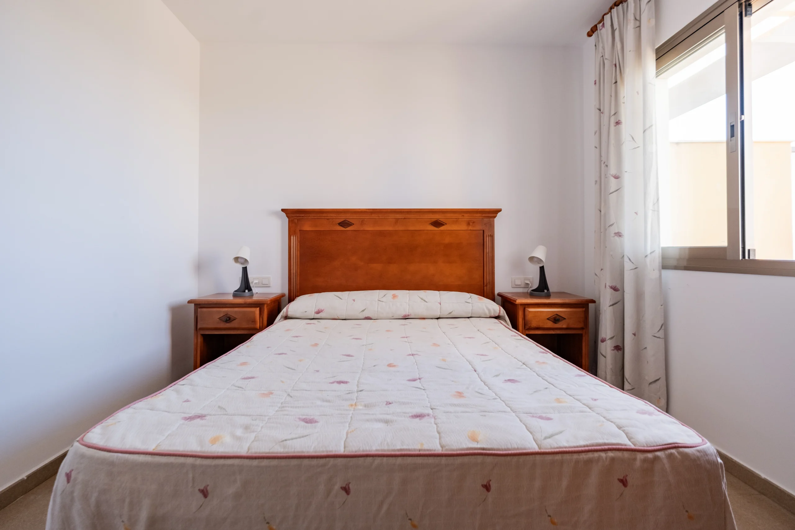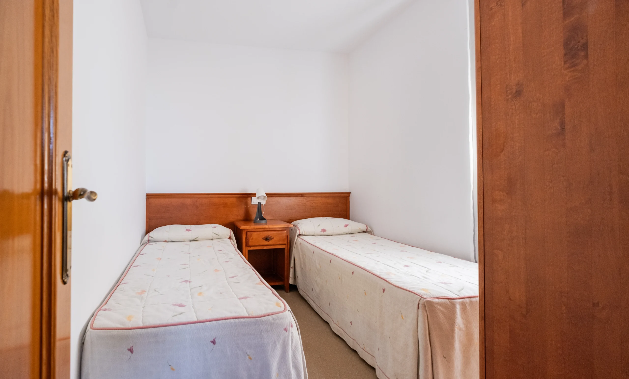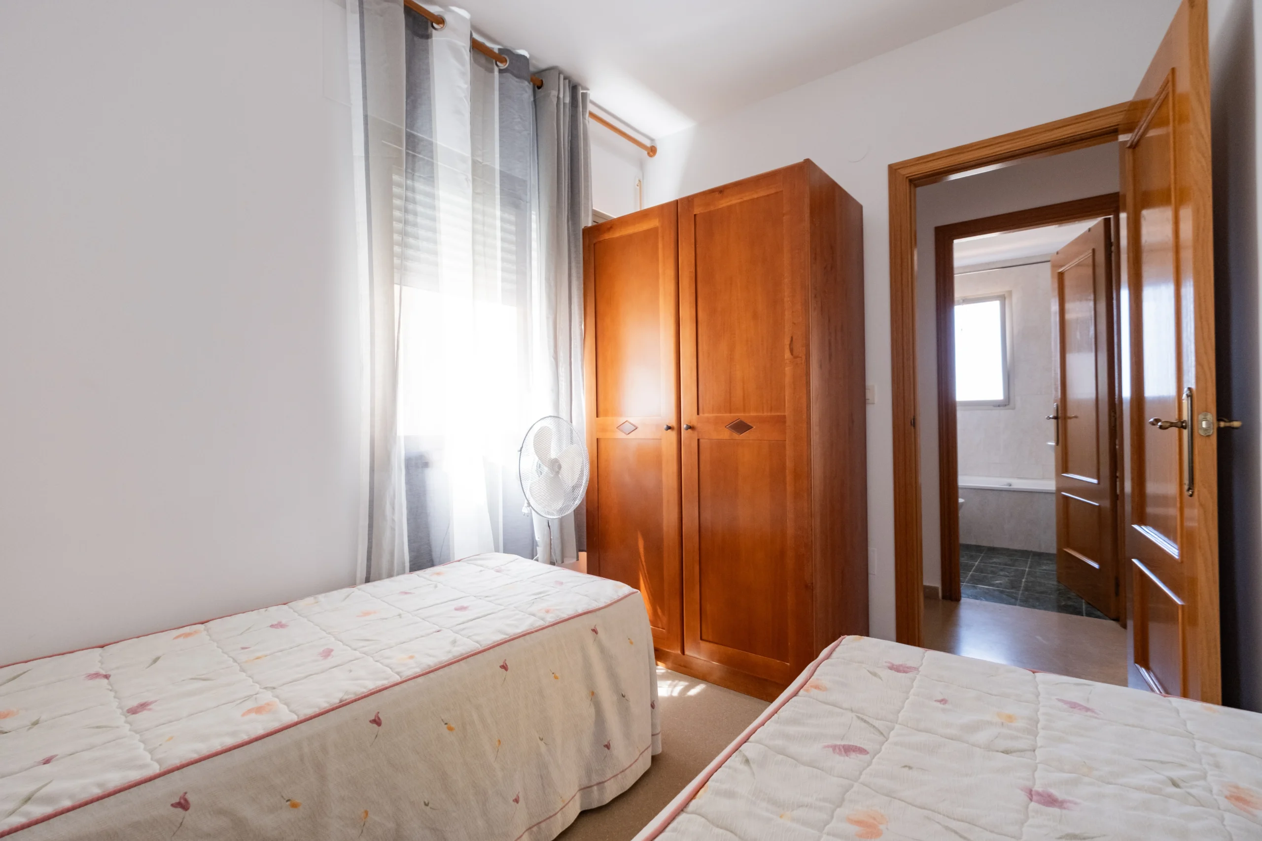El dormitorio principal cuenta con una cama doble perfecta para descansar tras un día de playa, mientras que el segundo dormitorio, con dos camas individuales, ofrece un espacio práctico y acogedor para niños o amigos.